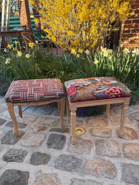 Je rénove ces assises avec des tissus tendances, des couleurs audacieuses.